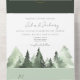 Beautiful bold green design contrasts with light forest watercolor trees.