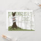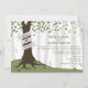 A wedding invitation featuring an illustration of a tree with roots on a hill of green grass. Tree has banner wrapped around it. Personalise with names.Row of trees in the background. Leaves are green. Personalise the text with details of your occasion. Wording is from bride and groom.