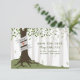 An outdoors wedding save the date featuring an illustration of a tree in the forest with green leaves and exposed roots with a banner wrapped around the trunk for couple's names.