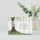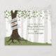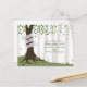 A wedding save the date postcard featuring an illustration of a tree in the forest. Tree has green leaves, exposed roots, and a trunk wrapped with banner that can be customised with bride & groom's names.