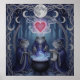 This whimsical poster features three cloaked frog wizards chant around a glowing cauldron under a full moon, heart-shaped magic rising amid moon-phase motifs and an enchanted Celtic forest.