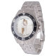 Has heft and feel of expensive stainless steel quartz watches. Good band with safety catch. I removed links, which is easy because engraved arrows show direction to push the linking pins. As always by this seller, the image (a railroad logo) is a perfect reproduction of my emailed image, and is precisely spaced and aligned.