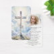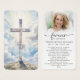 This memorial prayer card design features a prominent Christian cross with a radiant sky background, symbolizing faith, peace and eternal hope. Paired with a soft photo layout and the phrase “Forever in Our Hearts" with name and dates, the design offers a comforting tribute for honoring a loved one’s life and spiritual legacy. The reverse side includes an editable "The Lord’s Prayer," providing words of devotion and reassurance for family and friends during funeral services, memorial gatherings or celebration of life ceremonies. Its small and portable size (3.5x2") makes this keepsake card convenient to carry as a reminder of their life and spirit. Personalization makes these cards unique.