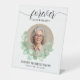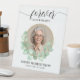 Modern memorial funeral pedestal sign features the wording 'Forever in our Hearts', your loved one's photo surrounded by a eucalyptus wreath, their name, and their birth/death dates. MATCHING items in our collection.