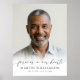 Forever In Our Hearts Photo Modern Script Memorial Welcome Poster Sign. Honor your loved one’s memory with this elegant poster board sign, designed as a touching tribute for a funeral, memorial service, wake or Celebration of Life event. Featuring the heartfelt title Forever in Our Hearts in a modern handwritten script, this design beautifully accents your loved one’s photo along with their name and life dates in black on a white ombre photo overlay for a classic yet elegant style. OPTIONS: The sample is shown in a 18x24" size on Value Paper (Matte); other standard and custom print sizes and paper quality, Instant Digital Download file for printing locally or transferring the design to a foam board, banner, canvas or other product options are available on the ordering page. RESIZING TIP: Choose Custom Size for even borders by changing the height and width proportionately AFTER clicking the UNLOCK icon (looks like a chain link). ASSISTANCE: For help with design modification or personalization, color change, resizing or transferring the design, contact the designer BEFORE ORDERING via the Zazzle Chat MESSAGE tab or email makeitaboutyoustore@gmail.com.
