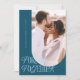 Vintage and elegant wedding announcement card featuring a typography text mixed with script and serif fonts that says "Forever Together" with a photo in an arched frame. The background is teal.