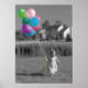 Nostalgic image of a little girl running at play with a bouquet of ballons. Black and whitw w/ selective colouring.