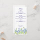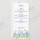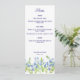 A wedding menu card featuring forget me now flowers.