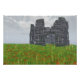 A 3D scene created in Vue, depicting the site of an ancient battle, with only the crumbling ruins of a mediaeval stone tower and red flowers in the grass to commemorate it. The falling rain and soft watercolor effect enhance the sadness of the hilltop scene.