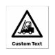 Triangle shaped warning sign. Warning: Fork lift trucks and other industrial vehicles. Custom text.