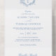 Classic & elegant vibrant blue monogram crest wedding invitation with detachable RSVP card on the bottom.