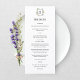 Celebrate your special day with our Elegant Wildflower Botanical Monogram Crest Wedding Menu, a timeless design inspired by the romance of a blooming spring meadow. This beautifully arranged menu features your custom monogram centered within a classic crest silhouette, gracefully framed by hand-illustrated wildflowers in soft purple, blush pink, and delicate yellow tones. Airy greenery and intricate botanical details add natural movement and texture, while the structured crest brings a refined sense of heritage and sophistication. The result is a design that feels both regal and organically enchanting, perfectly suited for an elegant reception. Ideal for spring and summer weddings, garden celebrations, vineyard receptions, and romantic outdoor soirées, this menu adds a polished and cohesive touch to each place setting. it can be beautifully coordinated with matching invitations, signage, table numbers, and day-of stationery for a seamless wedding suite. Romantic, refined, and effortlessly graceful, the Elegant Wildflower Botanical Monogram Crest Wedding Menu enhances your tablescape and offers guests a stylish preview of the dining experience to come.
