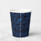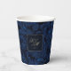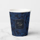 Elegant wedding paper cup in a formal style featuring a classic layout of gold frame and text with an ornate paisley background in shimmering navy blue. Add your initials in this beautiful script font and wedding date in a classic serif with it's traditional appeal. Search ID767 to see other color choices for this design.