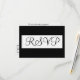 Formal black and white wedding. RSVP is written in elegant black script inside white and geometric rectangle. Personalise backside details in black typography against white background. Original Designs by TamiraZDesigns.