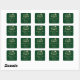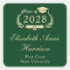 Formal green and gold graduation sticker for your graduation announcements, party invitations and thank you cards featuring "Class of" in a laurel wreath with a grad cap and diploma, the graduate's name in an elegant script, and their school name in modern classic typography.
