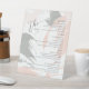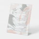 These light and airy 8" x 10" elegant formal dinner pedestal dinner menus feature an abstract leaf design in shades of soft blush and sage with the message, "The Menu," with placeholders for 2 appetizers, 3 entrees, 2 sides and 2 desserts.
