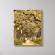 A photograph of Forsyth Park in Savannah, Georgia (GA), USA showing a canopy gnarled of Oak tree limbs covered with Spanish over a dirt path and street light lights glowing. This travel souvenir photo was digitally enhanced to give it a painterly look.