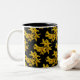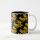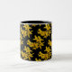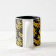 This decorative mug features an abstract pattern of golden yellow forsythia flowers. Forsythias are one of the earliest blooming shrubs in spring. When this flower shows its bright gold petals in the garden, we know that winter is gone for another year. Here they are set on a pure black background.