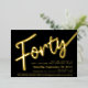 Forty black and gold foil text or your own foil colour. Personalise this 40th birthday party script art milestone birthday invitation with your own birthday party event details, and a photo of your birthday girl on the reverse. Other years, colours and matching items are available. © Original design by www.mylittleeden.com on Zazzle.