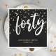 Modern 40th birthday party napkins featuring a stylish black background, gold confetti, the title 'forty' in a bold white script font, the saying 'happy birthday', their name, and the date of the celebration.