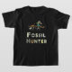 Fossil Hunter graphic shows a keen collector examining part of a fossil with the remains still buried below ground. Below are the words "Fossil Hunter" with the letters occasionally broken like a fossil might be. A fun design for fossil hunting fans.