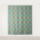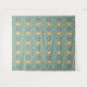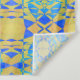 An intricate geometric pattern is formed by interwoven ribbons of blue and yellow hues, creating a kaleidoscopic and harmonious effect. The repeating shapes draw the eye across a symmetrical grid, evoking a sense of balance and rhythm.