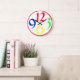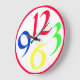 A big, round clock with just four very big and bold funky numbers, 3, 6, 9 and 12, in red, green, yellow and blue on a white background, with a red border.