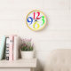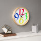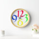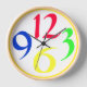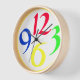 A big, round clock with just four very big and bold funky numbers, 3, 6, 9 and 12, in red, green, yellow and blue on a white background, with a yellow border.