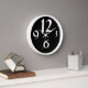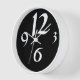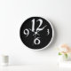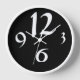 A big, round clock with just four very big funky numbers, 3, 6, 9 and 12, in white on a black background.