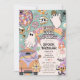 Retro Four Ever Spooky Halloween 4th Birthday Party Invitation - Let's get Groovy! Design features a colourful background with a boho rainbow. Cool retro illustrations decorate the simple template with adorable hippie ghosts, skull flowers, spooky disco ball and spooktacular candy.