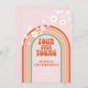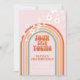 Retro inspired Four Ever Young 4th birthday invitation with hippie style rainbow, daisies and boho fonts and colours.