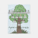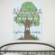 Four generations of your family tree are featured on this blanket. The names and the oval photos are set up as templates that should be changed to the names and photos of your own family members. The background features a green and brown tree drawing on light blue.