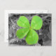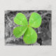 A postcard featuring a photo of a four leaf clover. Clover is green, background is black and white.