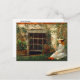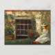 A fine art postcard with the painting, The Four-Leaf Clover (1873), by Winslow Homer (1836-1910) an American artist from the Realism movement. A girl in a white dress with a straw bonnet sitting by a glass paned window holding a four-leaf clover, next to planters of geraniums.