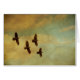 Photo of four ravens flying in formation past the clouds in a blue sky. A texture was added to this image to give it an antique look.