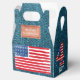 This favour box has a denim looking background. On the front and back of the box is the American flag. On the sides the number four and the words "of July". There's clip art on the front that looks like a leather patch, that can be customised.