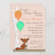 Woodland fox baby shower invitation with birch trees and orange and green balloons.