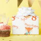Birthday wrapping paper in snow white with a fox cub wrapped up warm design. Personalise this fox art birthday paper with your child's name and age. Currently reads Happy Birthday Sofia 8 today. Ideal for young fox, animal or general woodland wildlife fans. Cute whimsical fox painted in watercolor and designed by Sarah Trett.