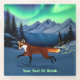A red fox (Vulpes vulpes) running through a snowy, winter night with the Northern Lights aglow over distant mountains; sparks emanate from the fox's tail. Customise by adding your own text.