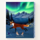 A red fox (Vulpes vulpes) running through a snowy, winter night with the Northern Lights aglow over distant mountains; sparks emanate from the fox's tail. Customise this product by adding your own text.