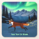 A red fox (Vulpes vulpes) running through a snowy, winter night with the Northern Lights aglow over distant mountains; sparks emanate from the fox's tail. Customise by adding your own text.
