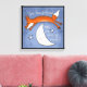 A cute whimsical fox is seen leaping over the sleeping half moon. Caption says, “the fox jumped over the sleepy moon!” Pretty blue sky with a couple of bright stars. This will be a great addition to a young person’s room. This will be perfect for the woodland-themed Playrooms, bedrooms and nursery rooms. Original design by Christie Black of Creations from the Heart.