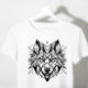 your majestic geometric fox t-shirt design, featuring deep black and grey tones, an simple background, and black eyes for a powerful and simple look.