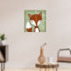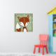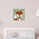 A digital painting of a whimsical fox is seen against the green wood-grained background. Little white flowers are seen on vines hanging in the right hand corner. Beautiful painting in soft colours is perfect for any woodland themed area, whether it be a baby nursery, daycare facility, or play room.