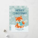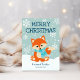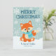 Woodland animal theme Christmas card features a cute fox in a winter scarf sitting in snow with a background of snowflakes. You can personalize both greetings (shown here with "Merry Christmas" and "Warmest Wishes") and the name. Original artwork KL Stock.