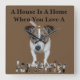 Featured is a brown and white Fox Terrier with A Fox Terrier logo a house is a home logo.
