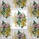 Old-fashioned botanical illustration of foxgloves in yellow, pink and orange