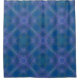 This shower curtain features a complex and intricate design. The pattern is an almost fractal design that, as it repeats across the curtain, reveals a larger box-frame pattern. The background is a serene ocean blue, with the overlaid textures in lighter shades of blue and purple, creating a captivating and modern visual.