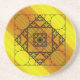 Three styles of hand-drawn fractals, including Siepinski triangles, Apollonian gaskets, and a similarly themed square design, make up the layers of this geometric mandala, overlaid onto a bright yellow and orange gradient.