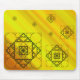 Three styles of hand-drawn fractals, including Siepinski triangles, Apollonian gaskets, and a similarly themed square design, make up the layers of this geometric mandala, overlaid onto a bright yellow and orange gradient.